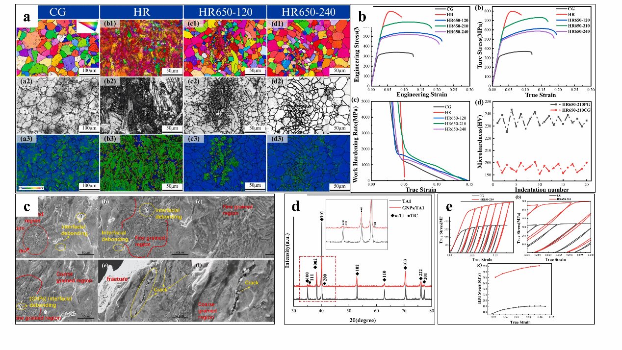 近年来,钛基复合材料(TMCs)因其优异的比强度和耐腐蚀性在航空航天等领域具有广泛应用前景,但传统TMCs普遍面临强度与塑性难以兼顾的挑战。尽管通过添加陶瓷颗粒或碳纳米管等增强相可提升强度,但高体积分数下往往导致材料塑性显著下降。石墨烯纳米片(GNPs)作为一种新型纳米增强体,因其超高模量和独特二维结构被视为改善金属基复合材料性能的潜在候选者。然而,单一结构的GNPs增强复合材料仍难以实现强度与塑性的协同提升。为此,本研究提出了一种异质结构(HS)设计策略,旨在通过GNPs诱导的异质结构实现TMCs强度与塑性的同步优化。