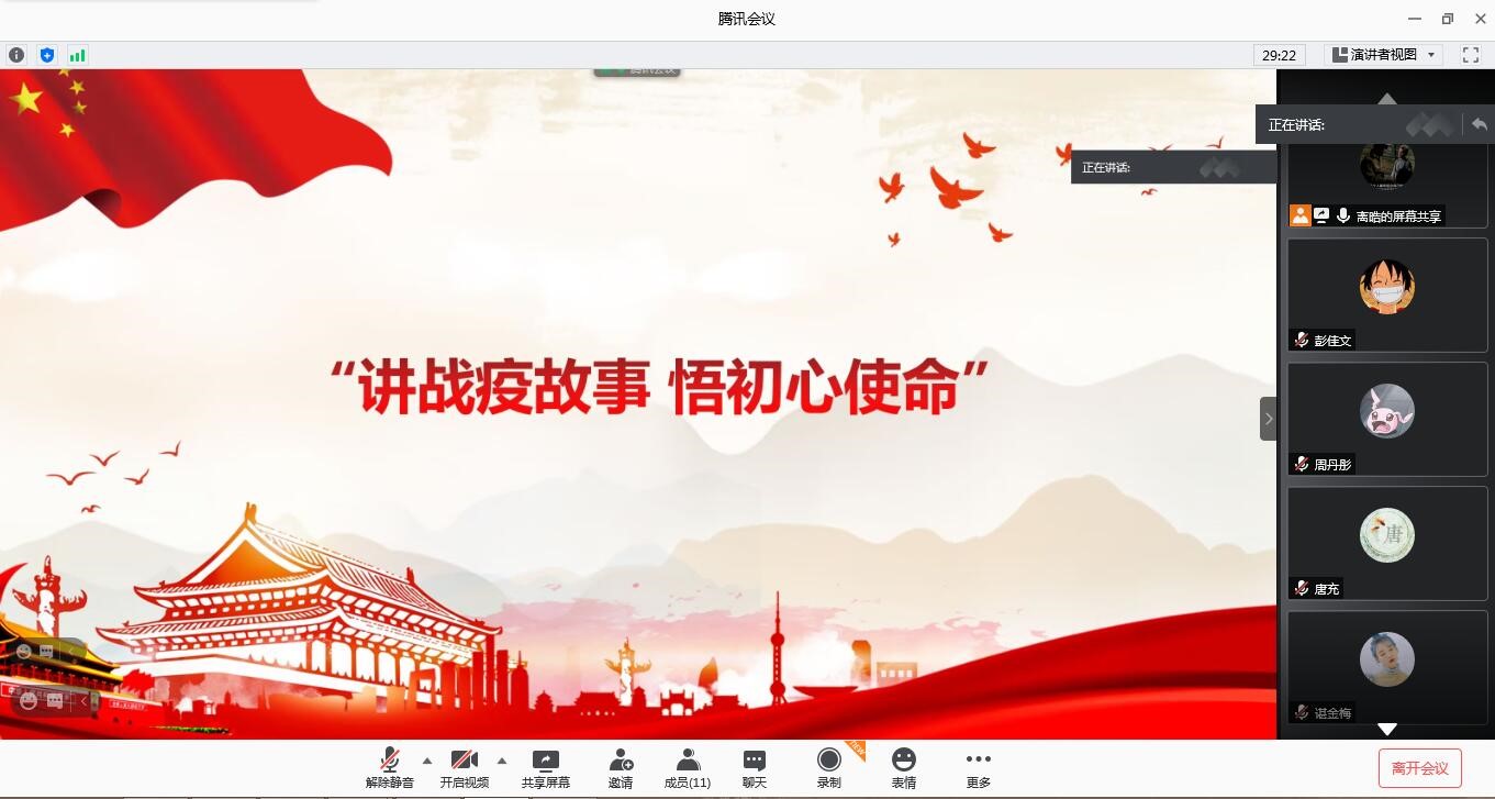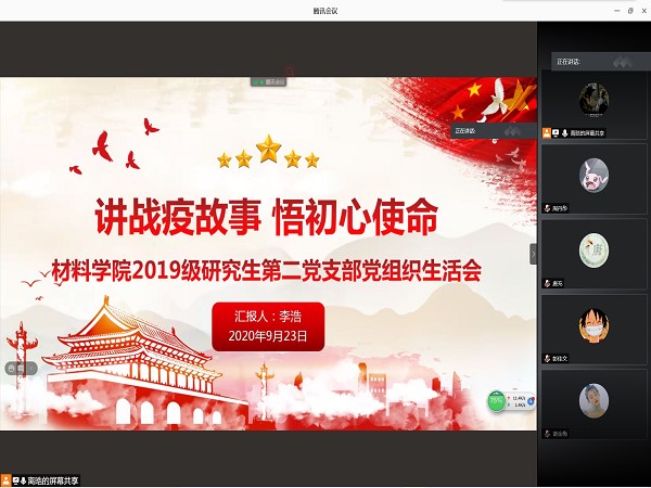 2020年9月24日晚上7:30,由于疫情影响本次组织生活会在腾讯会议上召开,会议由李浩同志主持。本次组织生活会的主题是“讲战疫故事,悟初心使命”。本次会议分为两部分内容,一是战“疫”一线党旗红;二是战“疫”中的初心使命。十九大报告中,习近平总书记开宗明义,强调了共产党人的初心和使命是“为中国人民谋幸福,为中华民族谋复兴”。
