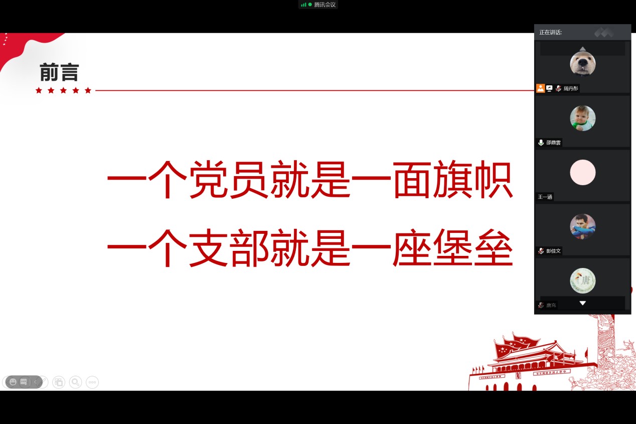 2020年9月9日晚上7:30,由于疫情影响本次组织生活会在腾讯会议上召开,会议由周丹彤同志主持。本次会议同志们进行了关于“让党旗在防控疫情,斗争第一线高高飘扬”专题微党课的学习。