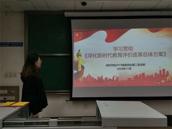 2020年11月2日晚上7:30,公司研究生第二党支部在逸夫馆4421召开第九次组织生活会,会议由周丹彤同志主持。本次会议同志们进行了关于《深化新时代教育评价改革总体方案》的学习。