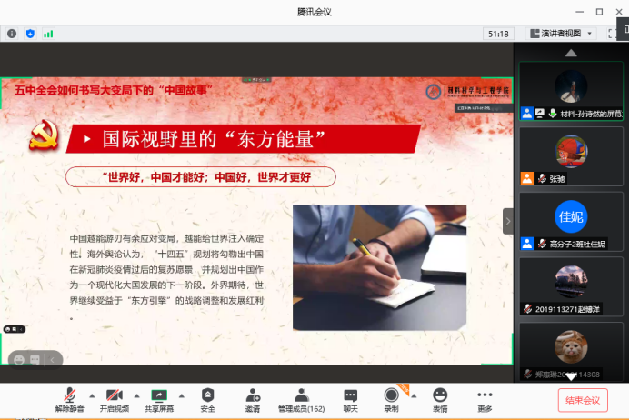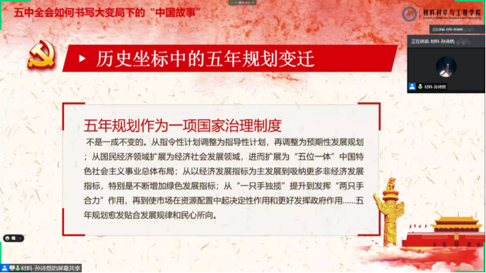 分享过后,通过放映的视频进一步学习党的十九届五中全会主要议程,讲解历史坐标中的五年规划变迁,学习五中全会如何书写大变局下的“中国故事”,进一步阐释“世界好,中国才能好;中国好,世界才更好”的深刻内涵,从而使同学们更好地了解党的十九届五中全会。