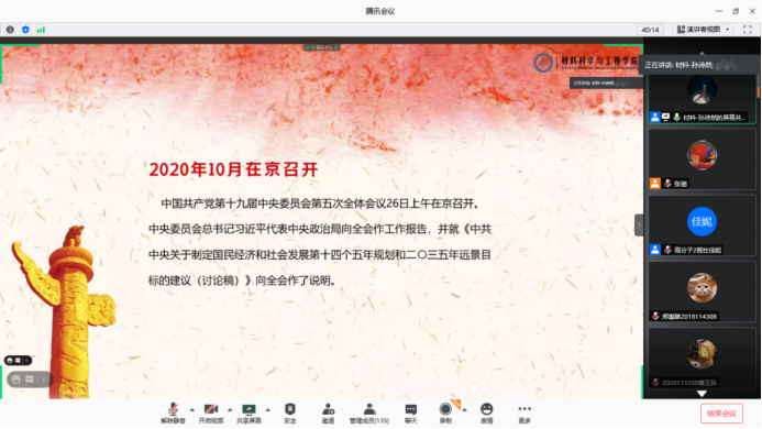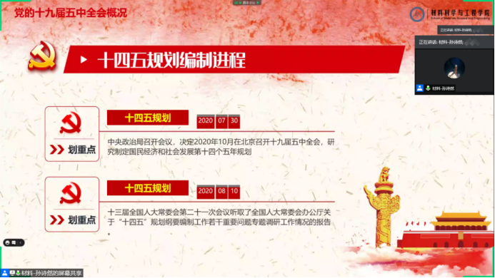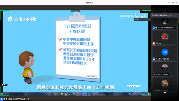 由孙诗然介绍讲解党的十九届五中全会概况,使同学们深刻了解党的十九届五中全会精神,进一步了解十四五规划编制进程等内容。