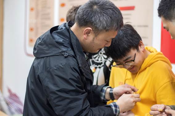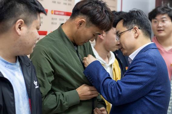 座谈结束后,党支部在x2127b党团活动室为新发展入党同志举行佩戴党徽仪式。公司党委书记陈勇、党委副书记章春军,辅导员老师梁喻嘉、罗丹为同志们佩戴党徽,并叮嘱同志们要在服务公司师生的各项工作中践行入党初心。