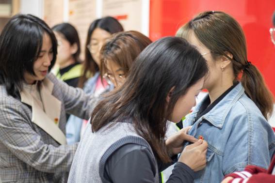 辅导员老师梁喻嘉、罗丹为新发展党员同志佩戴党徽