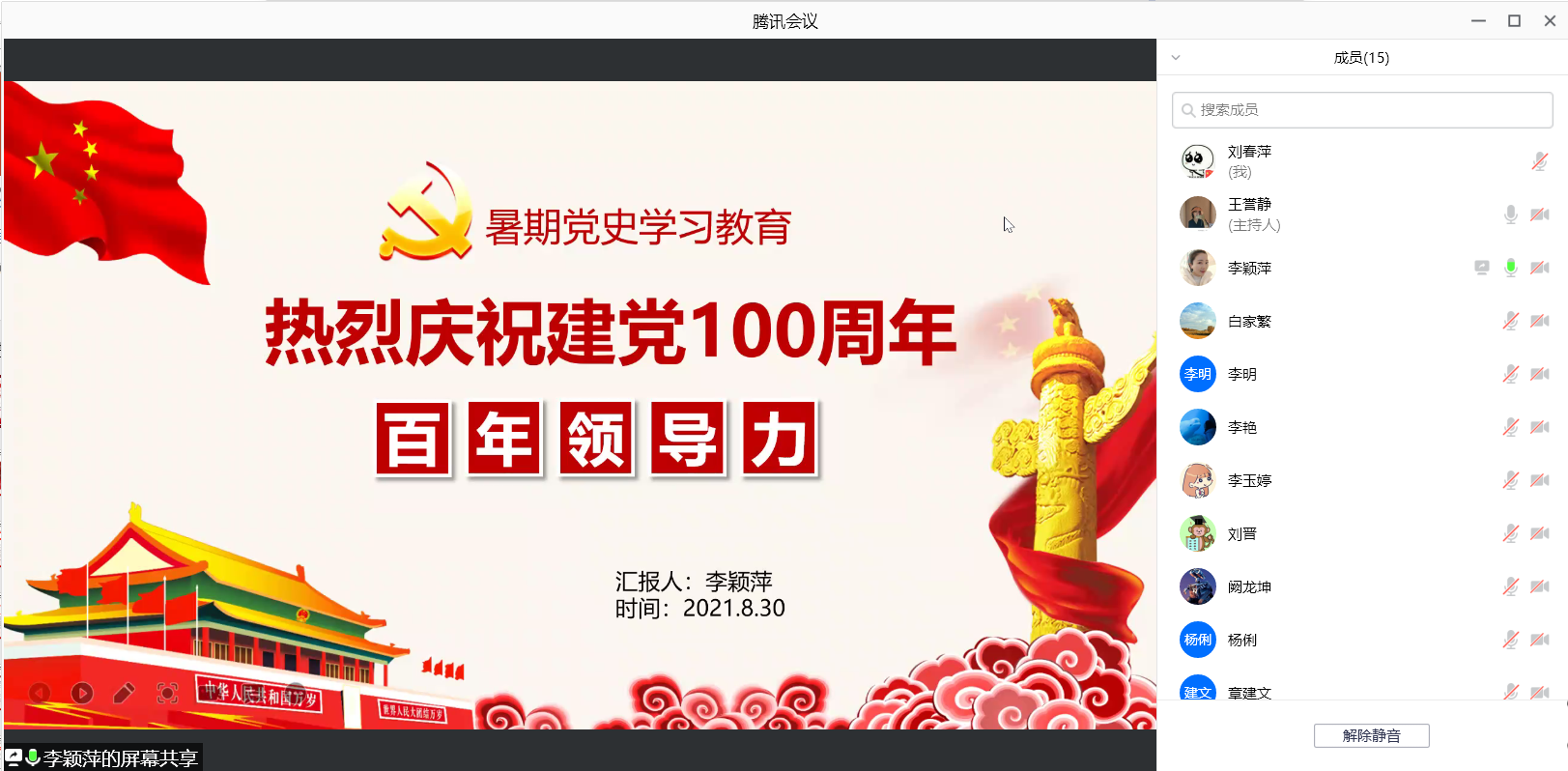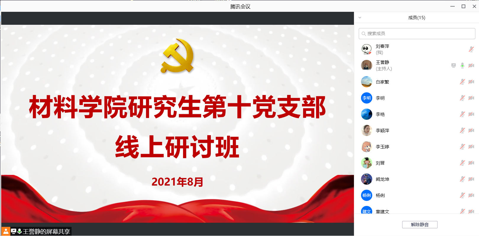 2021年8月30日晚,公司研究生第十党支部利用腾讯会议线上平台顺利开展暑期线上研讨活动。本次活动由党支部书记王誉静同志主持。