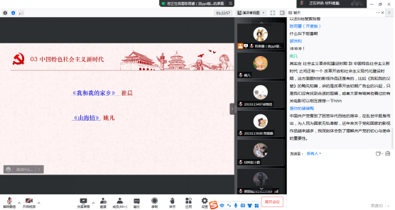 本次分享会包括的影视作品主要展现了三个不同时期中国共产党人的奋斗历程:首先是思想解放和新民主主义革命时期,同学们向大家分享了《觉醒年代》、《我的1919》、《建党伟业》、《1921》、《奇迹有密码》、《地道战》、《百团大战》、《潜伏》等作品,生动再现了这一波澜壮阔的历史画卷,描绘出中国共产党领导的广大军民群众投身革命的英雄气概;其次是社会主义革命和建设时期,同学们向大家分享了《那年那兔那些事》、《长津湖之水门桥》、《横空出世》等作品,淋漓尽致地展现出中华民族不畏强权,勇于自立于世界民族之林的顽强精神;最后是中国特色社会主义进入新时代,同学们分享的影视作品《我和我的家乡》、《山海情》中描绘了人民群众用辛勤劳动创造美好生活,贫困地区全面脱贫的时代画卷,见证了这段苦尽甘来、艰苦奋斗的创业历程。