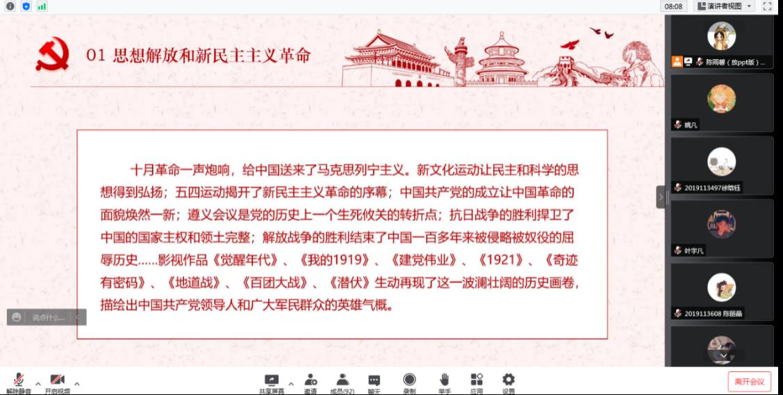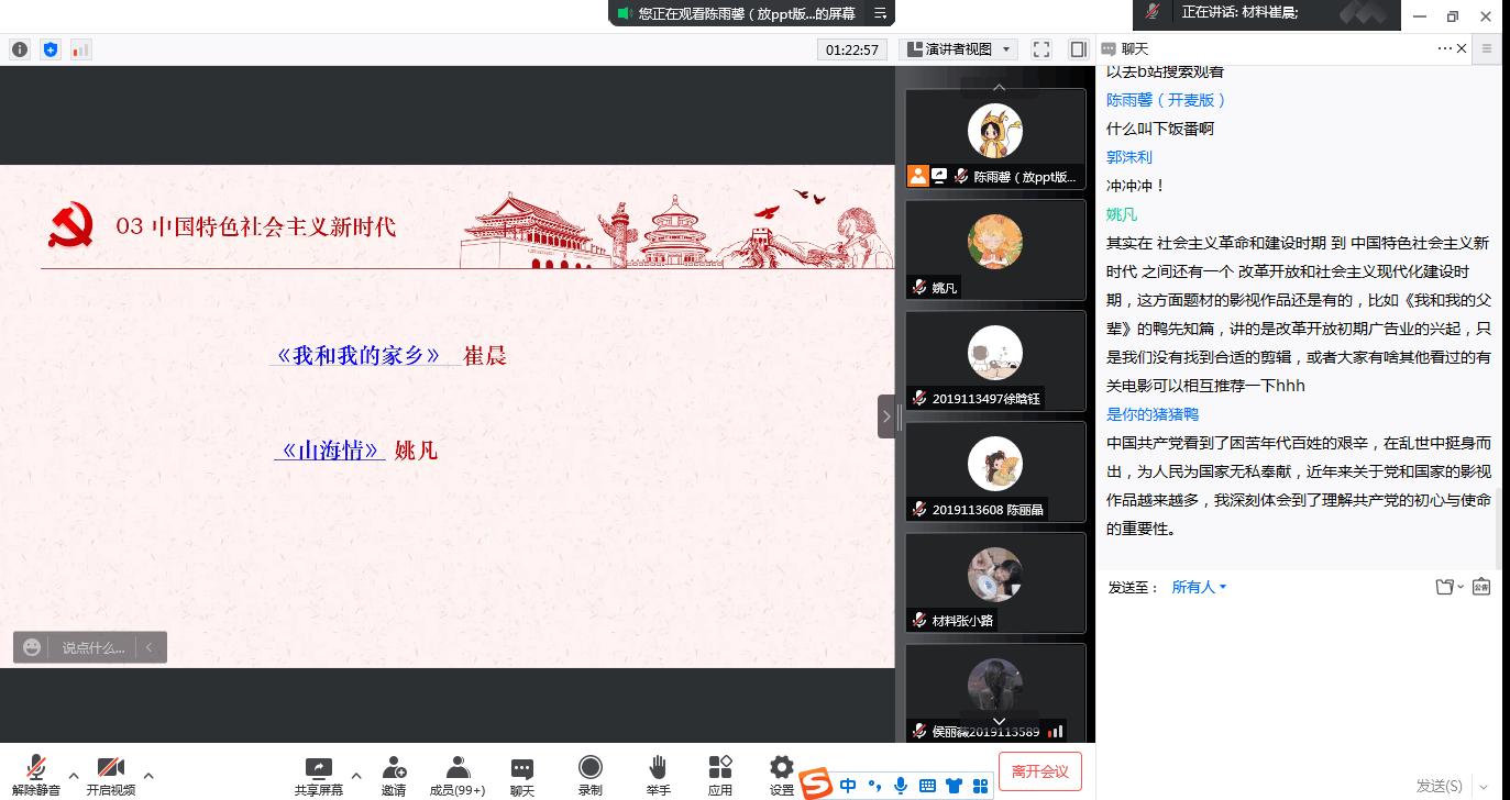 百年非凡奋斗历程,构筑起中国共产党人的精神谱系,为引导同学们坚定理想信念,在党的光辉历程中汲取奋进力量,太阳集团tyc151本科生第一(2019级)党支部于2022年5月19日19:30在线上面向全院员工举办了“重温红色经典,传承红色记忆”主题影视作品分享活动。本次影视作品分享会主要展现了新民主主义革命时期、社会主义革命和建设时期和中国特色社会主义新时代三个不同时期中国共产党人的奋斗历程,分享人带领大家见证了这段思想解放、民族崛起的漫漫奋斗征程。