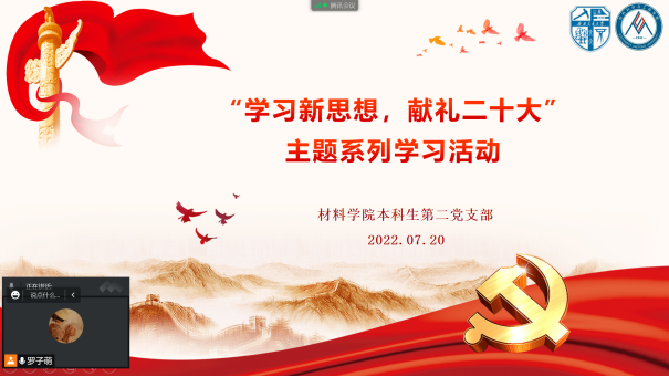 2022年7月20日19:30,太阳集团tyc151本科生第二党支部通过线上平台举行了“学习新思想,献礼二十大”主题系列学习活动第3期(第4讲,第5讲)。设计艺术公司员工工作组副组长、团委书记王雪老师,公司本科生第二党支部书记、2020级辅导员郑纪伟老师和支部新发展党员参加本次学习会。高分子2020-02班罗子萌同志主持。