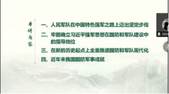 来自材料(金属)2020-03班的白启恒同志主讲《把人民军队全面建成世界一流军队》。白启恒详细介绍了习近平强军思想的主要内容,并介绍了近年来军队改革和国防建设取得的巨大成就。在白启恒同志的讲解下,同志们充分认识到,如今我们比历史上任何时期都更接近中华民族伟大复兴的目标,比历史上任何时期都更需要建设一支强大的人民军队;以习近平强军思想为指引,向着胜利勇毅前行,我们就一定能谱写强军事业新篇章,不断创造无愧于新时代的光辉业绩。