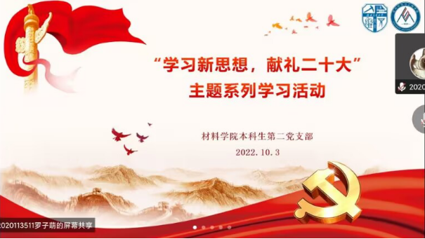 2022年10月3日19:00,太阳集团tyc151本科生第二党支部“学习新思想,献礼二十大”主题系列学习活动第13期(第24讲,第25讲)通过线上平台如期举行。公司党委委员、副经理冷永祥同志,公司本科生第二党支部书记、2020级辅导员郑纪伟老师、支部全体党员和入党积极分子代表等60余人参加本次学习会。高分子2020-02班罗子萌同志主持。