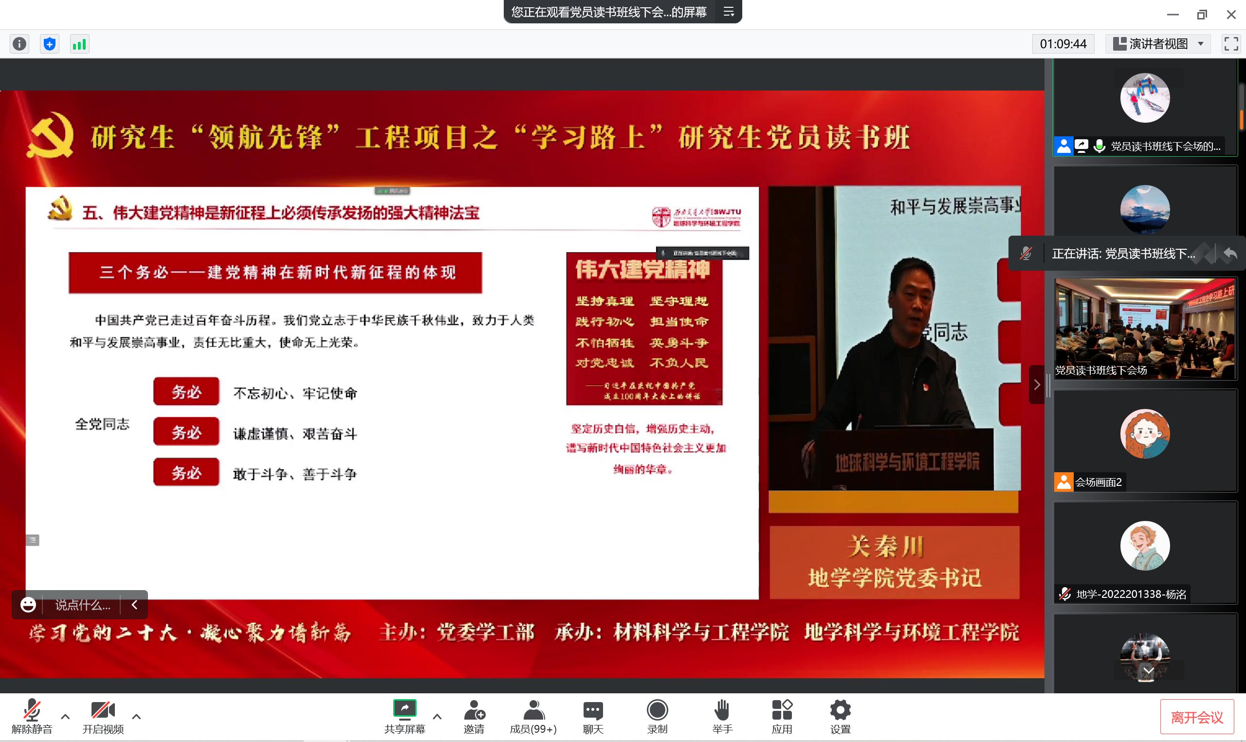 2022年12月8日下午16:30,地学公司党委联合公司党委以线上线下结合的方式共同开展“学习二十大·启航新征程”研究生党员读书班讲座。本次讲座由地学公司党委书记关秦川主讲,地学公司员工党建负责人文强主持,地学公司研究生党员代表于X4520线下学习,公司研究生党员及地学公司其它党员代表线上收看。