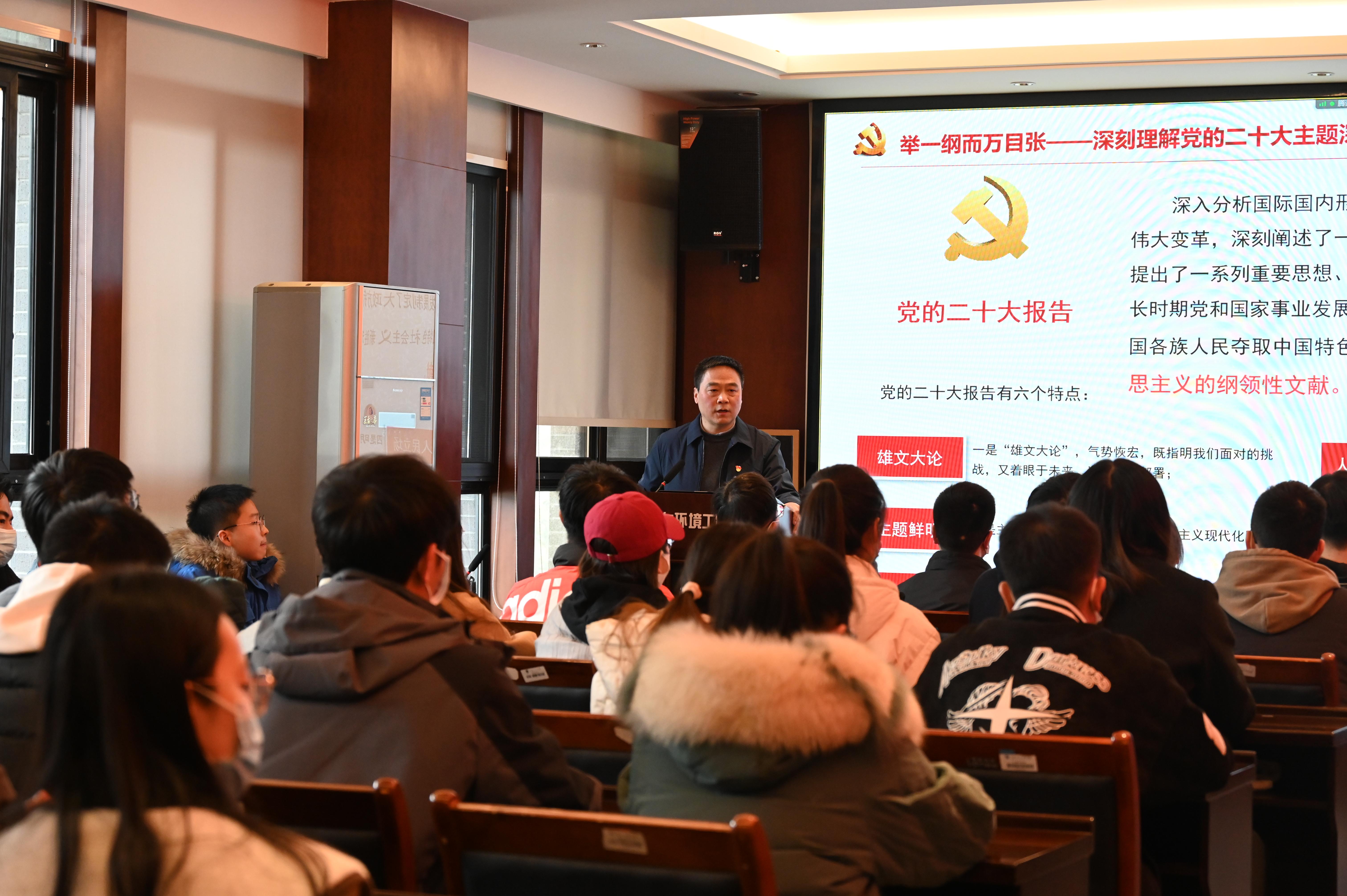 关秦川书记以“《举一纲而万目张——深刻理解党的二十大主题深邃意蕴》”为题展开本次讲座。他介绍了党的二十大议程、取得的成果,以及二十大的深远意义,随后从“关键时刻召开的一次十分重要的会议”、“党的二十大报告的基本框架和主要内容”、“中国特色社会主义是新征程上高举的伟大旗帜”、“习近平新时代中国特色社会主义思想是新时代新征程上党和国家必须全面贯彻的基本指导思想”、“伟大建党精神是新征程上必须传承发扬的强大精神法宝”、“自强自信,守正创新,踔厉奋发,勇毅前行是新时代新征程上必须保持的精神状态”、“团结奋斗是新时代新征程上实现‘两个全面’伟大目标的时代要求”等七个方面阐述了二十大主题中的深刻意蕴。