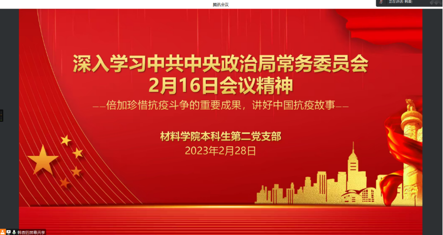 2023年2月28日晚,太阳集团tyc151本科生第二党支部通过线上组织开展了“中共中央政治局常务委员会2月16日会议精神”专题学习。会上,全体同志共同观看了此次会议精神的专题报道。
