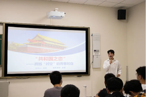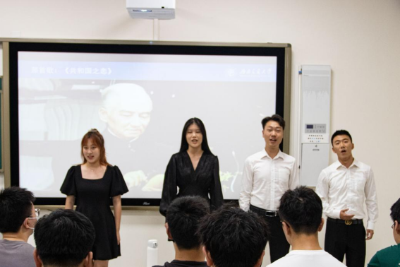 会议第二项,邀请到由马克思主义公司赵晨老师指导的“音乐里的故事”讲演团成员,为大家带来《共和国之恋——跨越时空的青春对白》,通过袁隆平、屠呦呦、华罗庚、付巧妹等前辈的事迹,深刻诠释了新时代科学家“朗朗报国志 ,巍巍中华心”的爱国之情。讲解期间,《共和国之恋》讲演团为大家带来合唱表演《共和国之恋》,拳拳爱国之心在悠扬的歌声中烙印在每一位同学的心中。