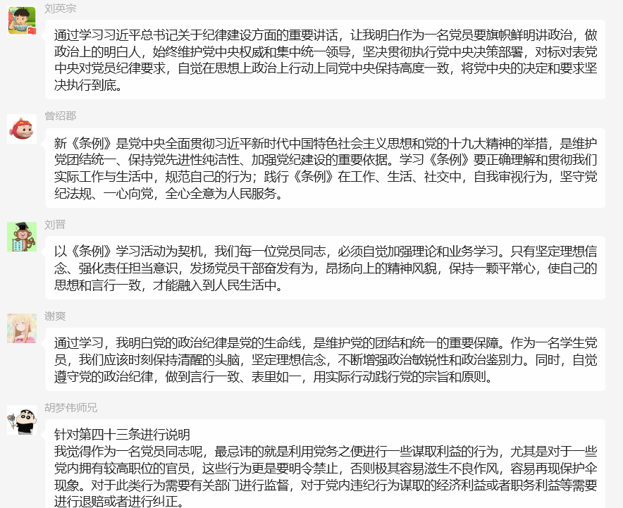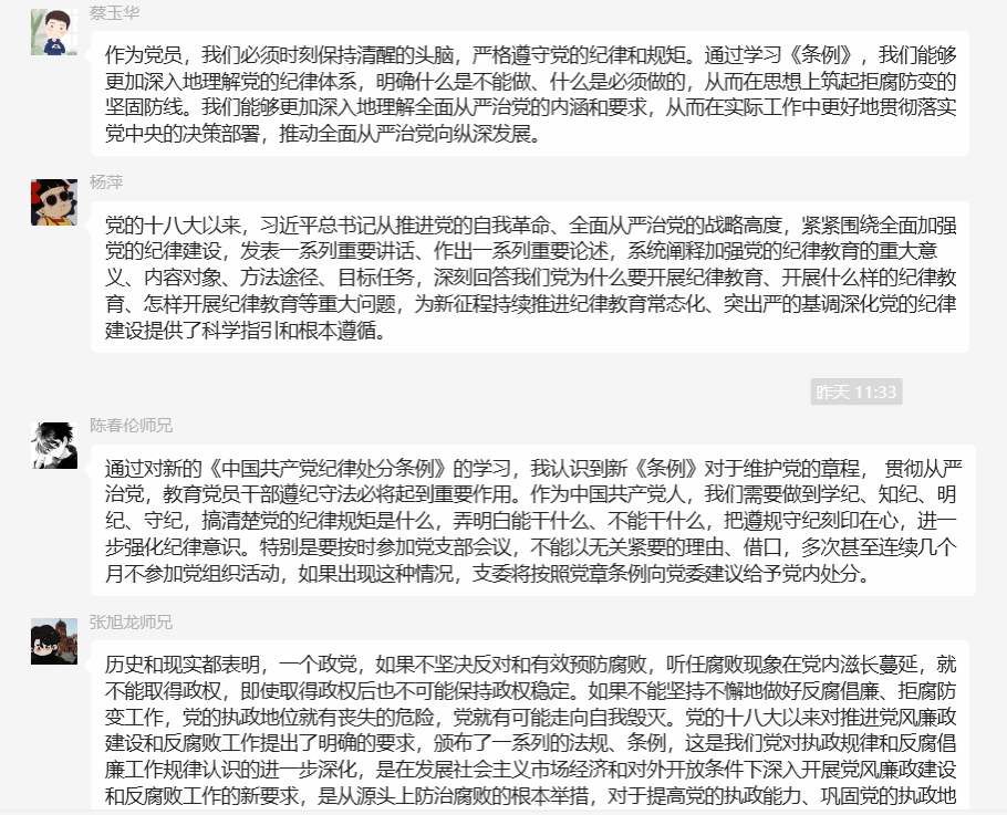 以学为基,严守党纪。未来,公司将持续抓好《条例》学习,切实加强警示教育,有序推进研究生党员党纪学习教育走深走实,引导研究生党员将党纪学习教育内化于心、外化于行。