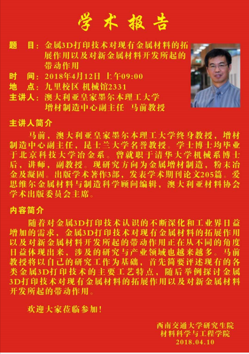 讲座时间:2018年5月4日(星期五)上午9:00 讲座地点:牵引动力国...