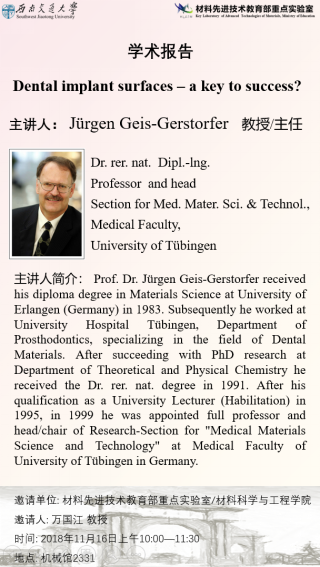讲座题目:Dental implant surfaces – a key to success?讲座时间:20...
